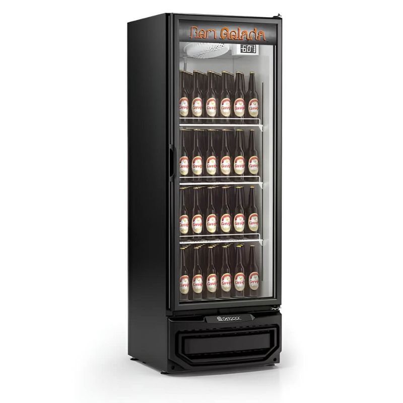 Com sua elegante cor preta e design vertical, a cervejeira GRBA400PV não só enriquece a estética do seu estabelecimento, mas também oferece um generoso espaço interno de 410 litros para uma ampla gama de bebidas.