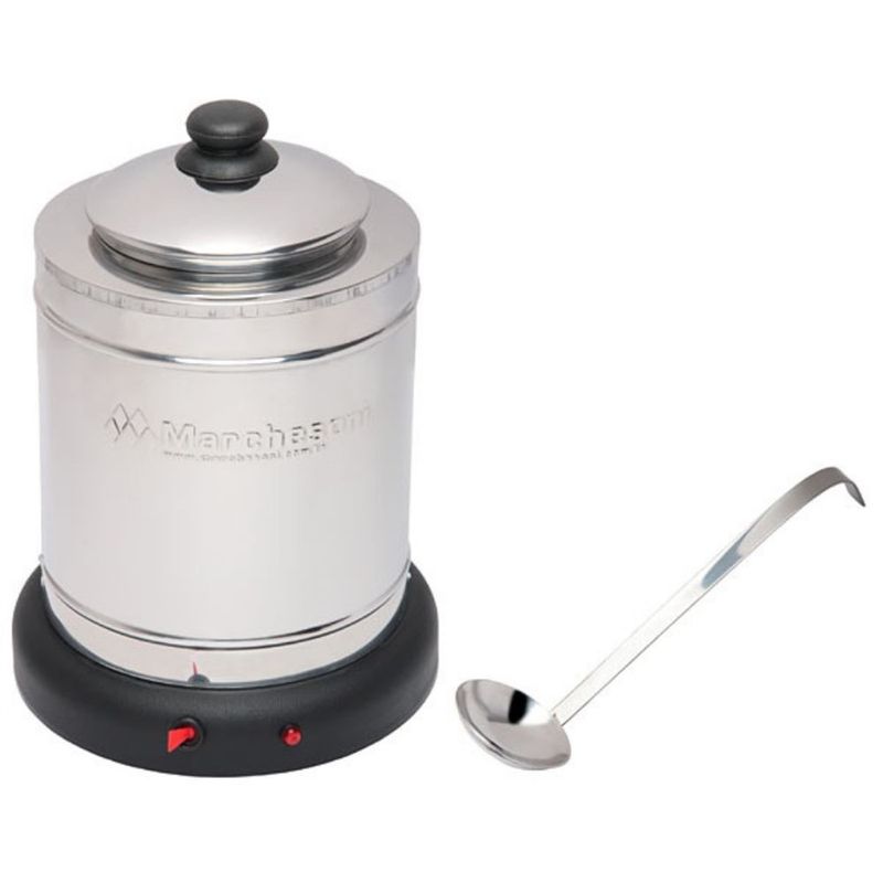 Corpo em aço inoxidável e base em nylon injetado; Acompanha concha em aço inox; Aquecimento por banho-maria. Não queima e não altera o sabor e as propriedades do chocolate; Termostato Pré Fixado para economia de energia elétrica; Ideal para manter o chocolate líquido, caldas e coberturas derretidos e quentinhos; Indicado para confeitarias, docerias, cafeterias, sorveterias, buffets, festas e eventos.