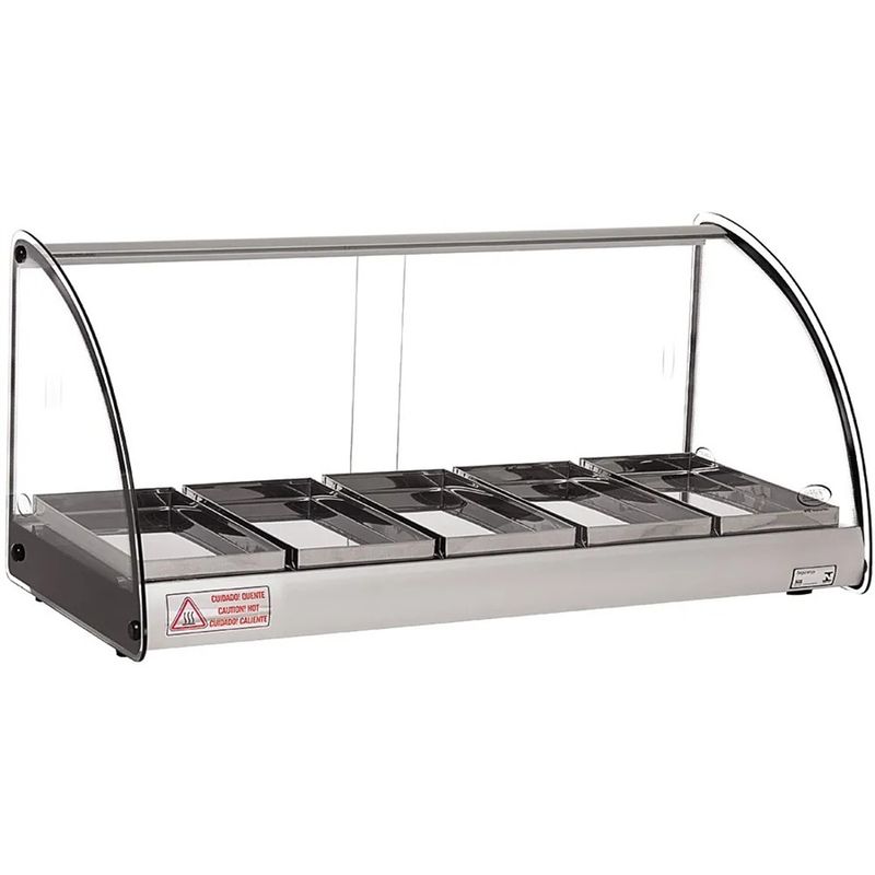 Desenvolvida com vidro temperado curvo, esta estufa oferece uma visualização perfeita, mantendo a temperatura ideal dos alimentos com um termostato preciso. A estrutura robusta é feita de alumínio anodizado e aço inox, com bandejas também em aço inox, assegurando durabilidade e facilidade de limpeza.