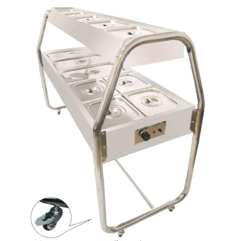 As cubas, no padrão gastronorm, foram medidas com precisão: a versão GN 1/2 fria tem 325 × 265 × 65 mm, a GN 1/2 quente atinge 325 × 265 × 100 mm; a GN 1/1 fria mede 530 × 325 × 65 mm e a GN 1/1 quente 530 × 325 × 100 mm. Complementando o design, o vidro curvo de 4 mm forma uma cobertura totalmente contínua, realçando a visibilidade e mantendo a higiene do buffet.