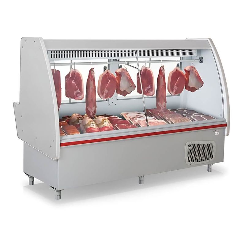 Este expositor frigorífico além de manter suas carnes na temperatura ideal, apresenta a exposição das carnes que atrairá os clientes. Com vidros temperados e um tendal simples em alumínio com ganchos, este expositor é tão funcional quanto atraente.