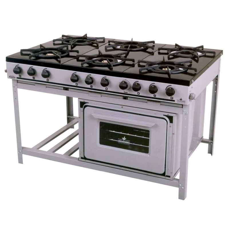Mesa esmaltada à fogo com easy clean; Corpo super reforçado em aço carbono com acabamento em pintura a pó eletrostática com base fosfatizada; Grelhas redondas em ferro fundido para todos os modelos; Queimador e grelhas em ferro fundido; Espalha chamas do queimador central em cobre; Forno com visor de vidro e equipada com mola para facilitar a vedação e reter o calor; Isolamento térmico em lã de rocha; Acabamento interno esmaltado a fogo; Forno acompanha 2 grelhas com limitador.