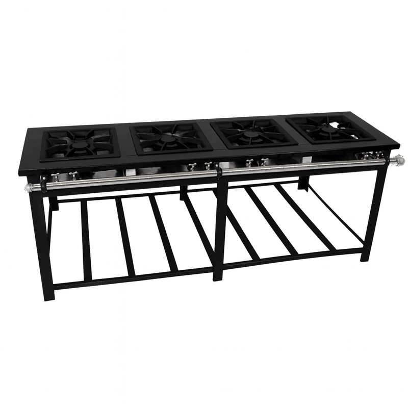 Fabricado em aço carbono com pintura eletrostática e base fosfatizada, o fogão entrega durabilidade e resistência ao uso contínuo. As grelhas em ferro fundido 40x40 garantem estabilidade, enquanto a mesa com perfil de 10 cm reforça a estrutura.