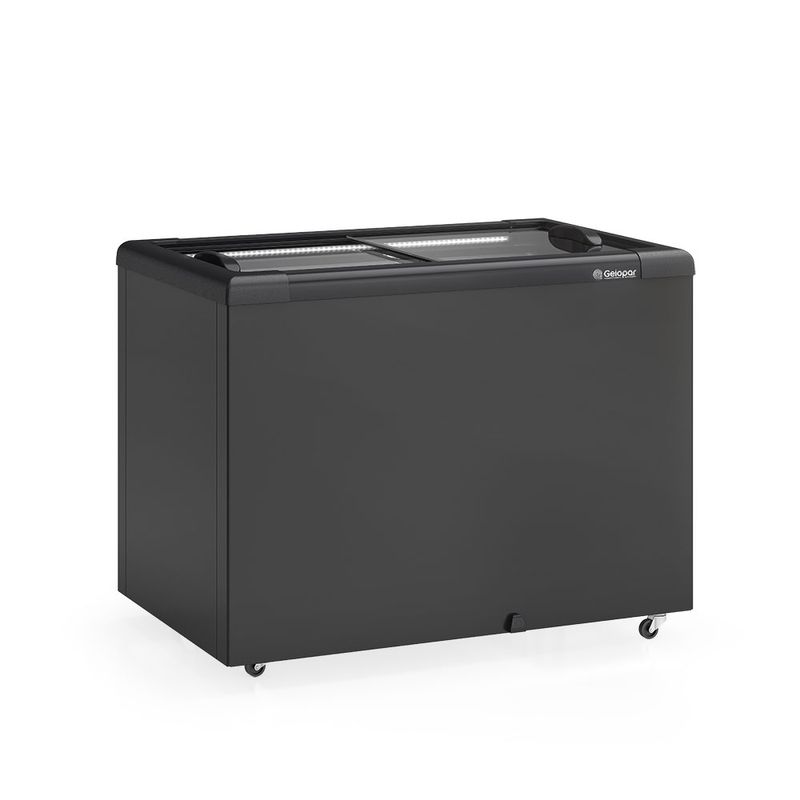 Freezer Horizontal Gelopar All Black possui 295L de capacidade e design moderno com acabamento preto. Conta com refrigeração estática por serpentina, ideal para conservar sorvetes e congelados entre -16 °C e -20 °C. O controle de temperatura é feito por termostato preciso.
