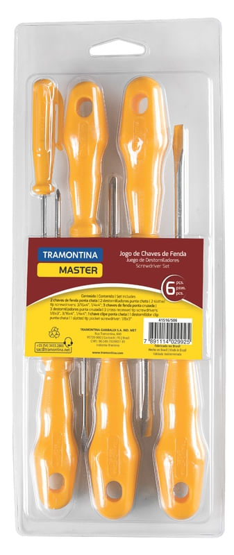 Se você preza por um completar seu kit de ferramentas, precisa do Jogo de Chaves de Fenda Tramontina Yellow 6 Peças. Um jogo que traz chaves de fenda com ponta chata, ponta cruzada e ainda uma chave clipe, ideal para fixar em cintos e alças e que é um coringa na hora de apertar ou afrouxar parafusos. Todas as peças são muito resistentes: têm hastes produzidas em aço especial cromado e cabos em polipropileno injetado. Além disso, são altamente duráveis e vão levar muito mais praticidade na execução de suas tarefas. Garanta o seu e facilite o seu dia a dia!