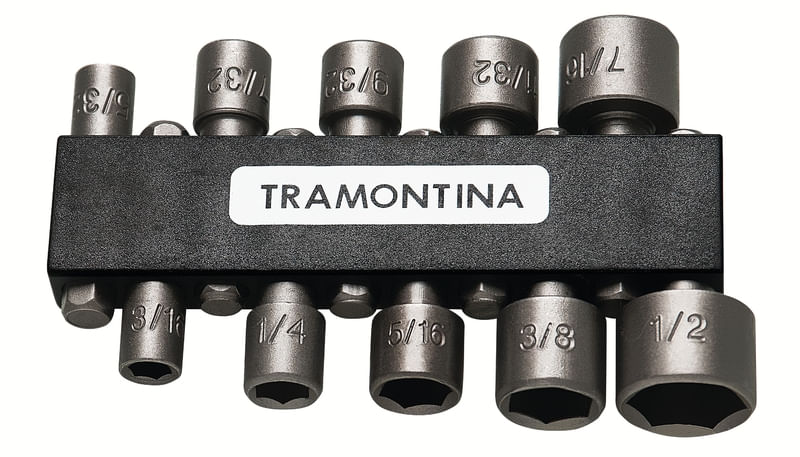 10 ponteiras sextavadas tamanhos: 5/32", 3/16", 7/32", 1/4", 9/32", 5/16", 11/32", 3/8", 7/16" e 1/2".
