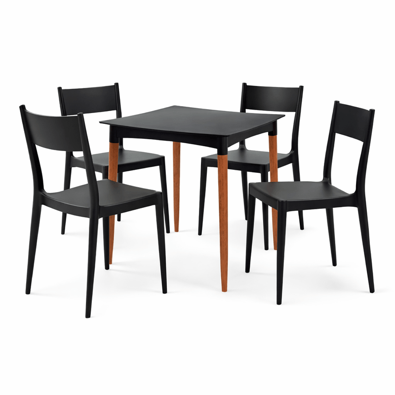 A mesa Tramontina Diana quadrada para 4 lugarescom tampo preto e pernas em eucalipto, combina perfeitamente com as cadeiras Tramontina em polipropileno com fibra de vidro ECO, oferecendo conforto, resistência e fácil limpeza para ambientes internos ou cobertos.