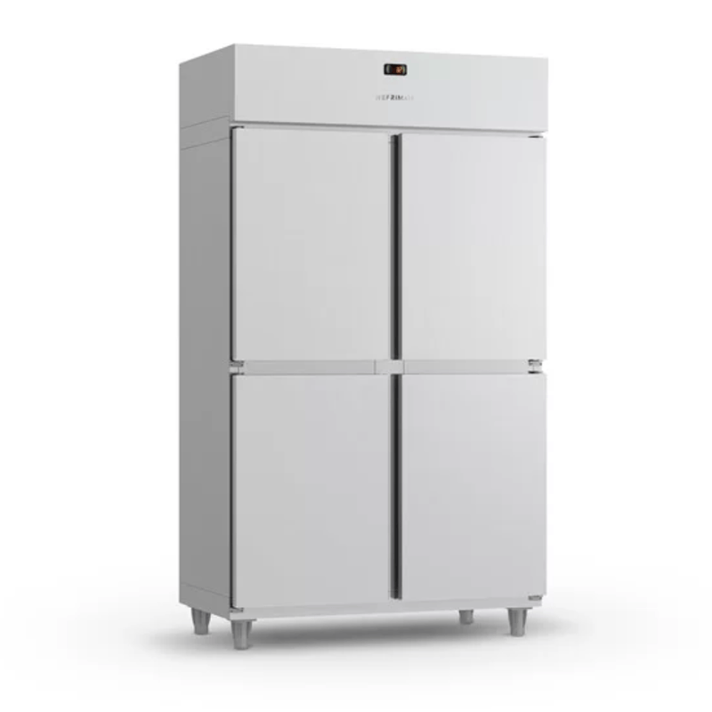O painel de isolamento de 35 mm mantém a temperatura interna de forma consistente, enquanto as portas pivotantes com fechamento automático garantem um acesso prático e eficiente aos alimentos armazenados.